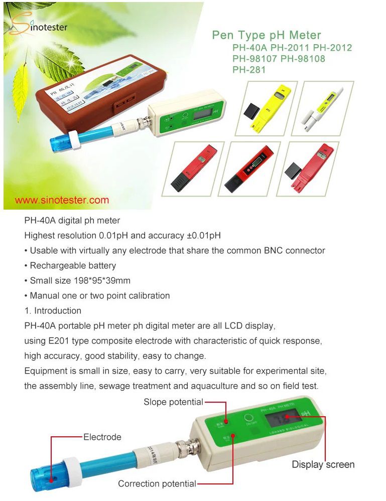Sinotester PH-40A ເຄື່ອງວັດແທກ PH ແບບເຄື່ອນທີ່ (0.00~14.00pH, ±0.01pH) | EMIN.COM.LA