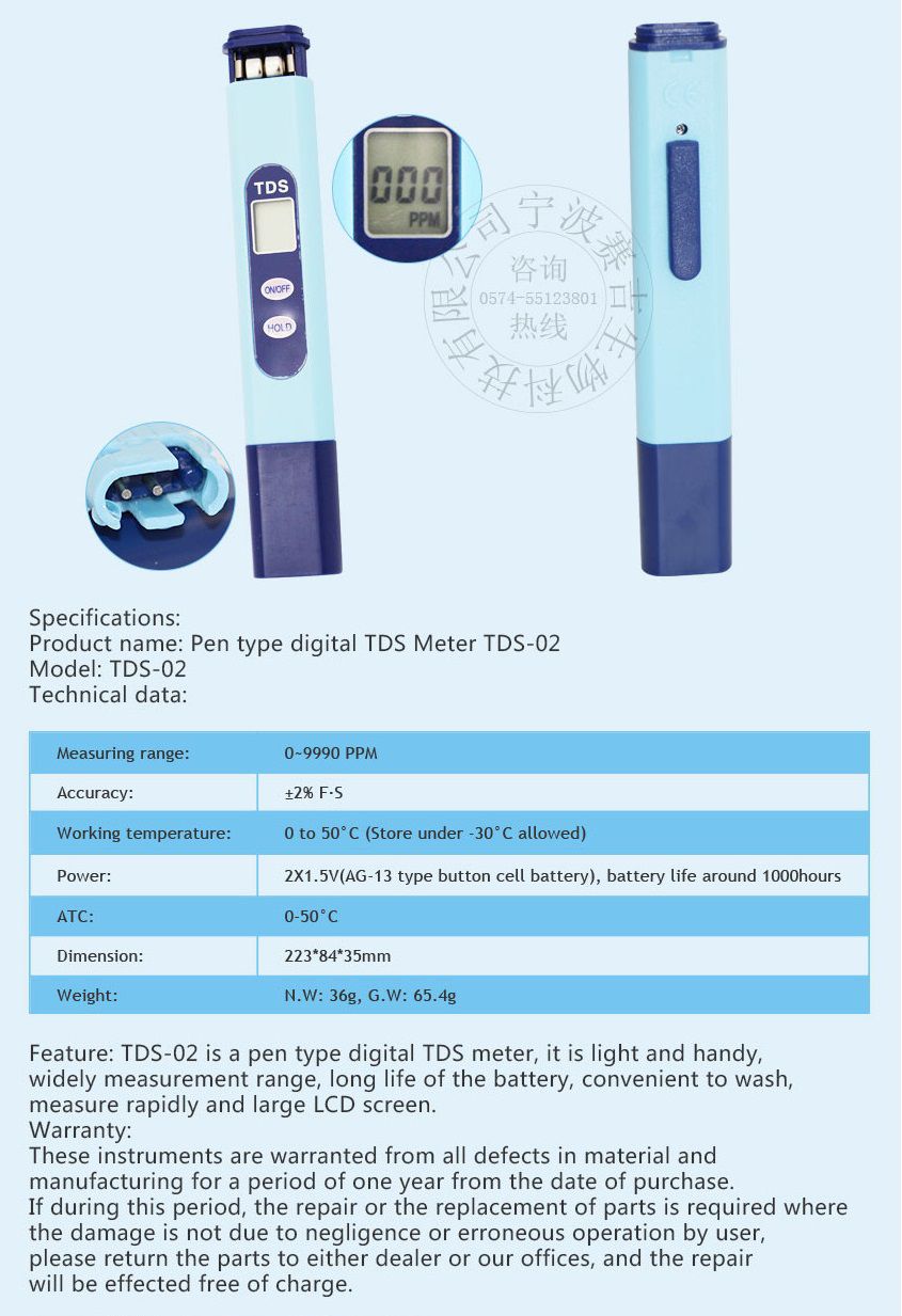 Sinotester TDS-02 ເຄື່ອງວັດແທກ TDS (0~9990ppm, ±2% F.S) | EMIN.COM.LA