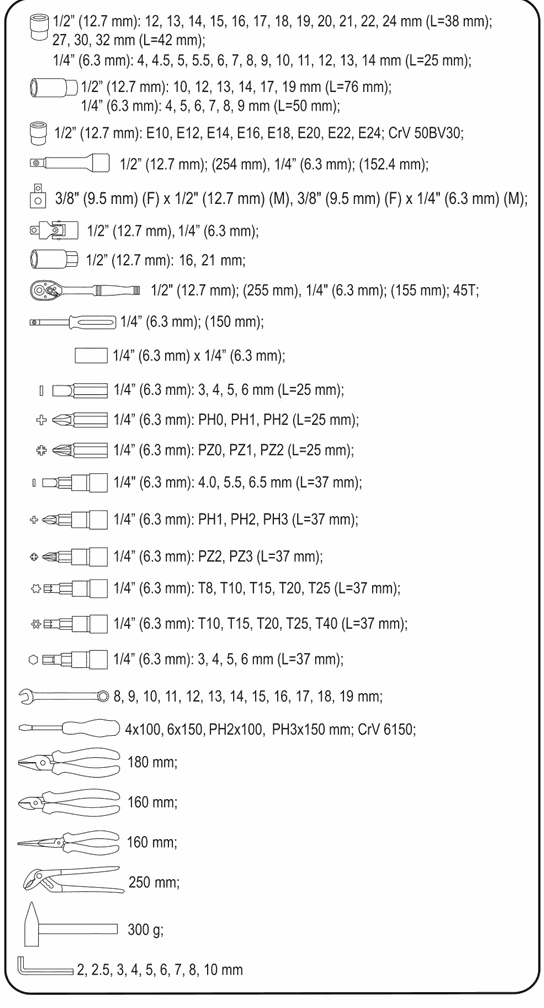 Hex keys: 2, 2.5, 3, 4, 5, 6, 7, 8, 10 mm
