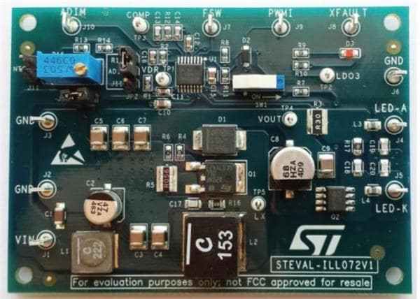STMicroelectronics STEVAL-ILL072V1 ບອດປະເມີນ ຊັ້ນດຽວ, 1 A ຄວບຄຸມການເພີ່ມກຳລັງຂອງຜູ້ຂັບ LED ລົດຍນະຍານ ສໍາລັບພາຍໃນ/ພາຍນອກ