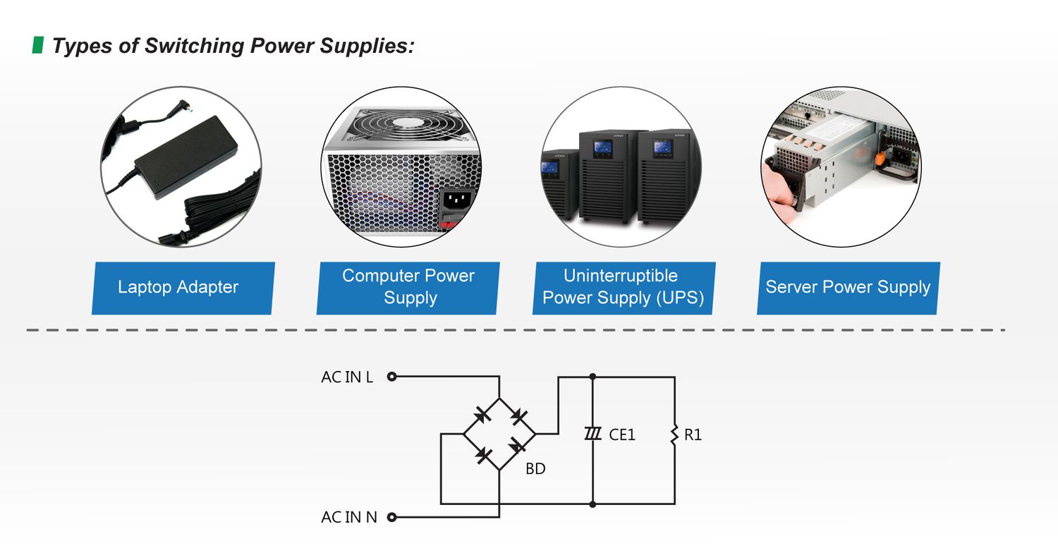 Switching power supply, one of the most common types of rectified loads, uses the power conversion technology to turn switching transistor on and off rapidly to provide regulated voltage. Examples are personal computer chargers, cell phone adaptor and uninterruptible power supply (UPS), which employ pulse-width modulation (PWM) controller ICs and MOSFET. With the continuous improvement and innovation in technology, switching power supplies have been widely applied in multiple industries due to its compact and lightweight characteristics and high efficiency. It is one of the key components that contribute to the rapid development of modern electronic industry.