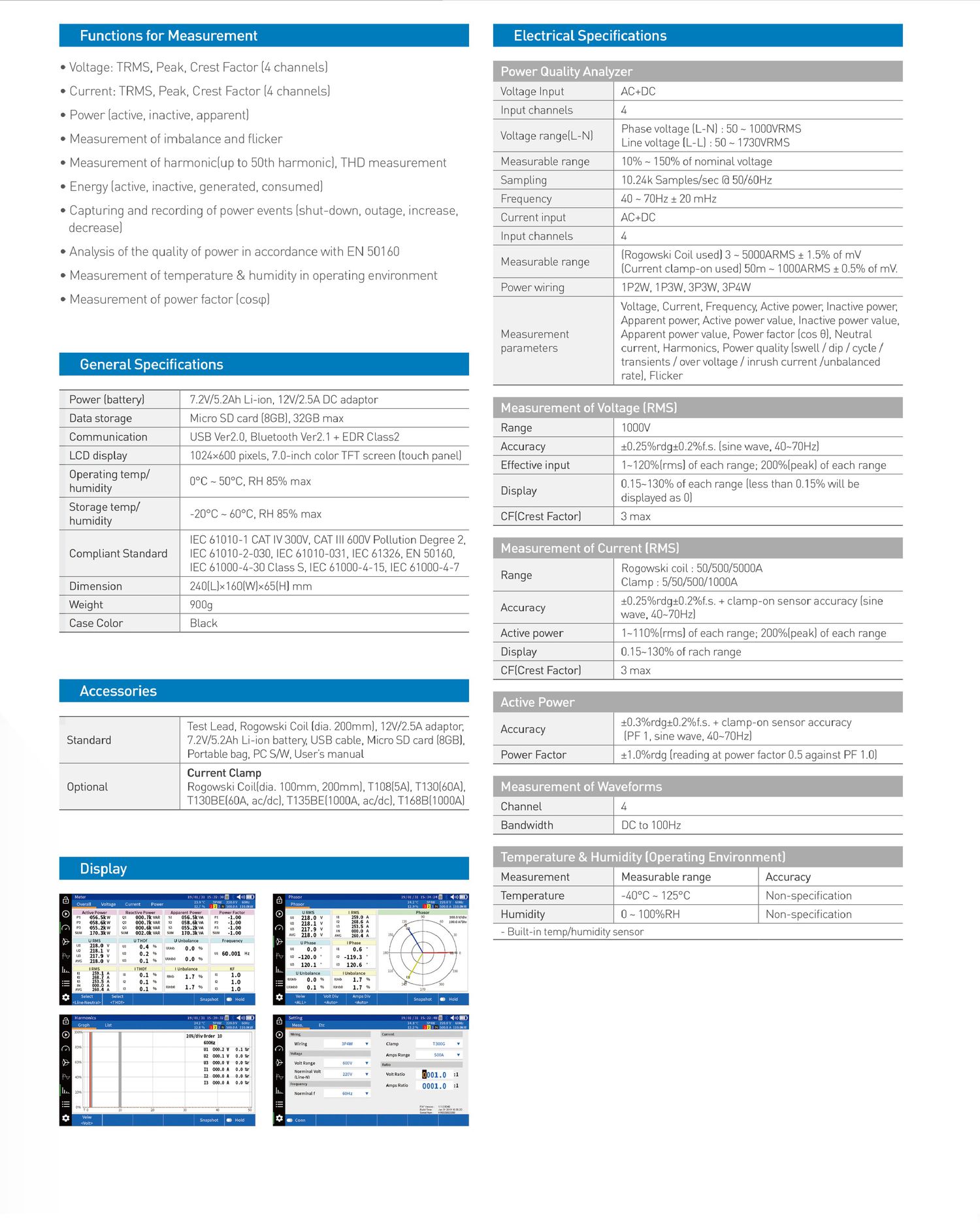 Simultaneously measures active/ reactive/ apparent power, power factor, RMS voltage/ current, phase angle and neutral line current