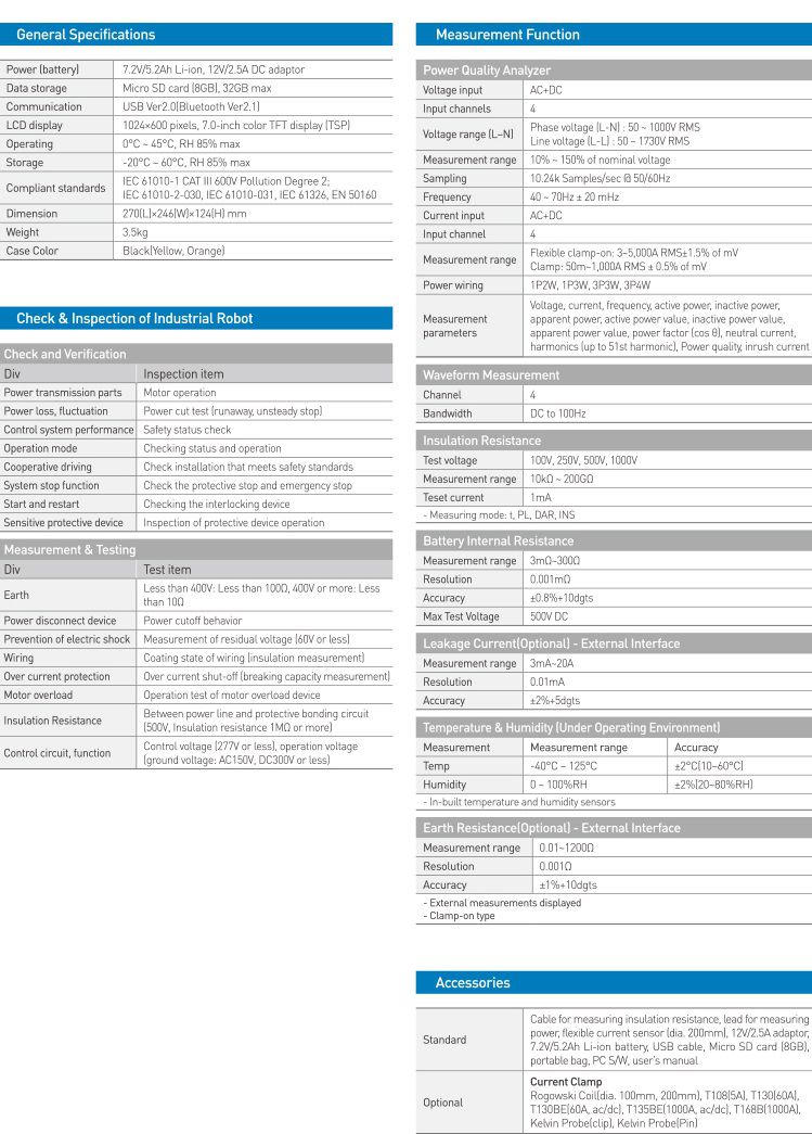Power measurement (3P), insulation resistance, battery internal resistance, harmonics (up to 50th harmonic), leakage current (optional), earth resistance (optional)
