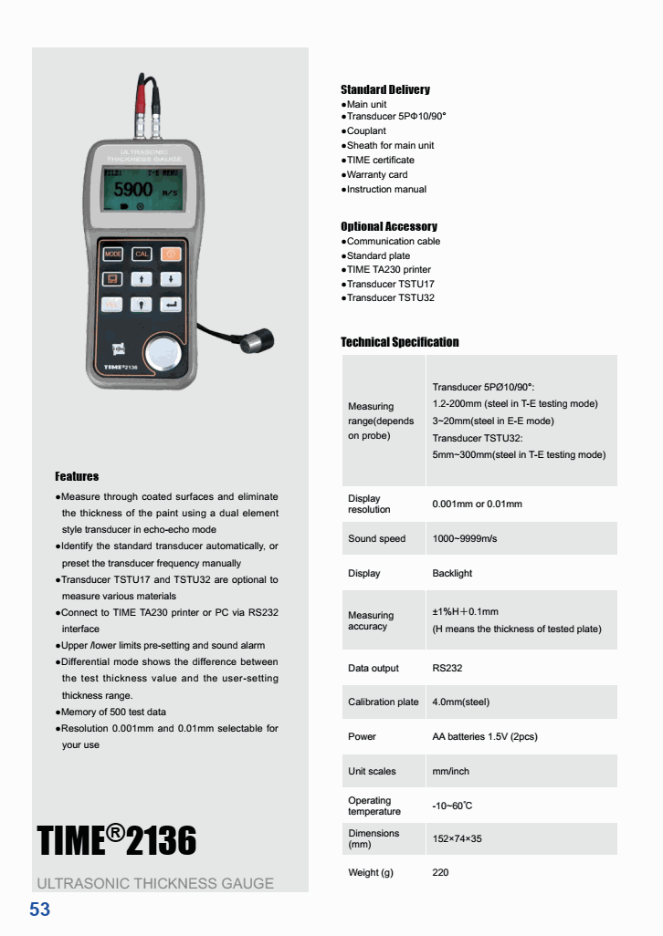 Transducer 5PØ10/90°: 1.2-200mm (steel in T-E testing mode) 3~20mm(steel in E-E mode)