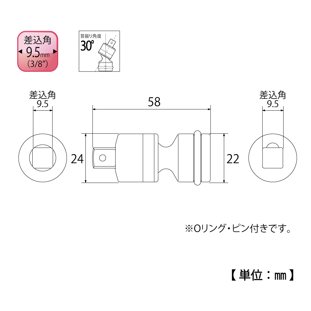 TOP Kogyo PUN-3 Impact Universal Joint (3/8', 58mm) | EMIN.COM.LA