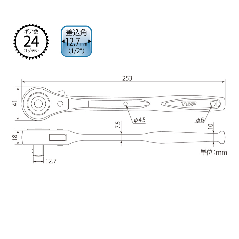 TOP Kogyo RH-4RP Heavy-Duty Ratchet Handle (Push-Release Type) (1/2'', 253mm) | EMIN.COM.LA