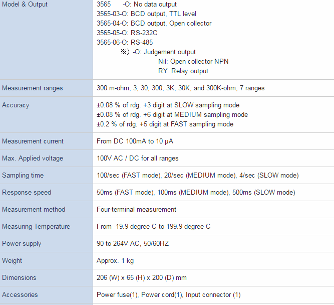 Measurement ranges 300 m-ohm, 3, 30, 300, 3K, 30K, and 300K-ohm, 7 ranges