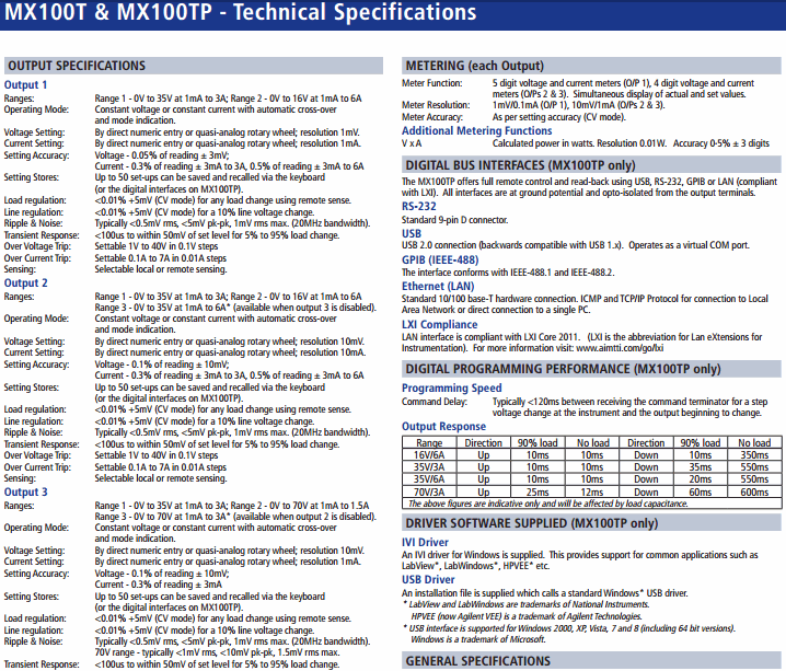 Ripple & Noise: Typically <0.5mv rms="" 5mv="" pk-pk="" 1mv="" rms="" max="" 20mhz="" bandwidth="" br=""> 70V range - typically <1mv rms="" 10mv="" pk-pk="" 1="" 5mv="" rms="" max="" br=""> Transient Response: <100us to="" within="" 50mv="" of="" set="" level="" for="" 5="" to="" 95="" load="" change="" br=""> Over Voltage Trip: Settable 1V to 80V in 0.1V steps