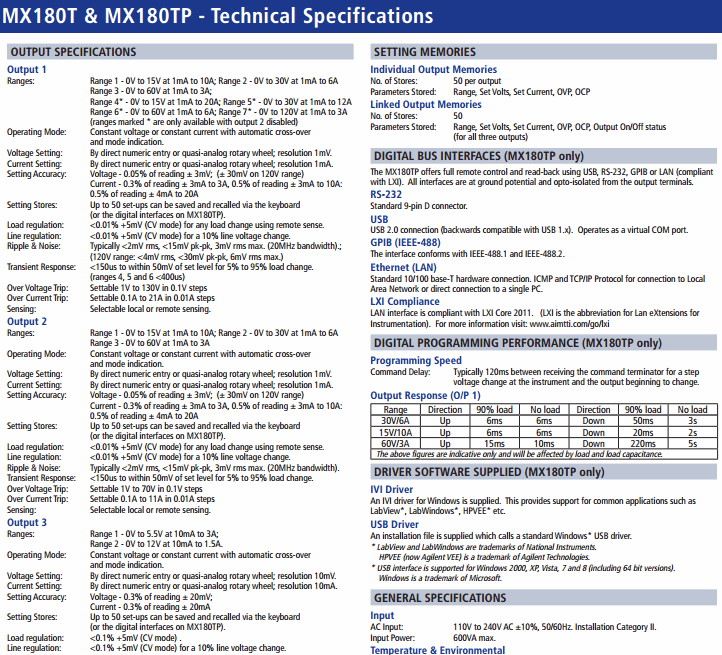 Ripple & Noise: Typically <2mv rms="" 15mv="" pk-pk="" 3mv="" rms="" max="" 20mhz="" bandwidth="" br=""> (120V range: <4mv rms="" 30mv="" pk-pk="" 6mv="" rms="" max="" br=""> Transient Response: <150us to="" within="" 50mv="" of="" set="" level="" for="" 5="" to="" 95="" load="" change="" br=""> (ranges 4, 5 and 6 <400us)